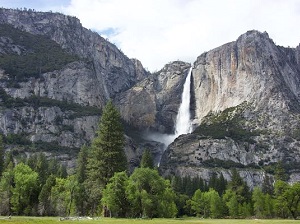 Yosemite Valley is a glacial valley in Yosemite National Park in the western Sierra Nevada mountains of Central California. The valley is about 7.5 miles (12 km) long and approximately 3000–3500 feet deep, surrounded by high granite summits such as Half Dome and El Capitan, and densely forested with pines. The valley is drained by the Merced River, and a multitude of streams and waterfalls flow into it, including Tenaya, Illilouette, Yosemite and Bridalveil Creeks. Yosemite Falls is the highest waterfall in North America, and is a big attraction especially in the spring when the water flow is at its peak. The valley is renowned for its natural environment, and is regarded as the centerpiece of Yosemite National Park, attracting visitors from around the world.